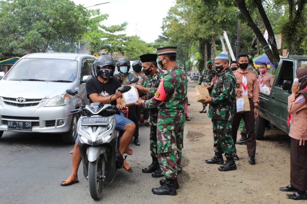Trenggalek – Pramuka Saka Wira Kartika Kodim 0806/Trenggalek membagikan takjil gratis untuk para pengendara kendaraan yang melintas di jalan Ponorogo – Trenggalek KM. 03, tepatnya di perempatan Lampu Merah Desa Buluagung, Kecamatan Karangan, Trenggalek, Jumat (23/4/21).