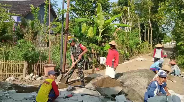 Babinsa Kamulan Bersama Warga Bergotong Royong Pasang Paving Jalan