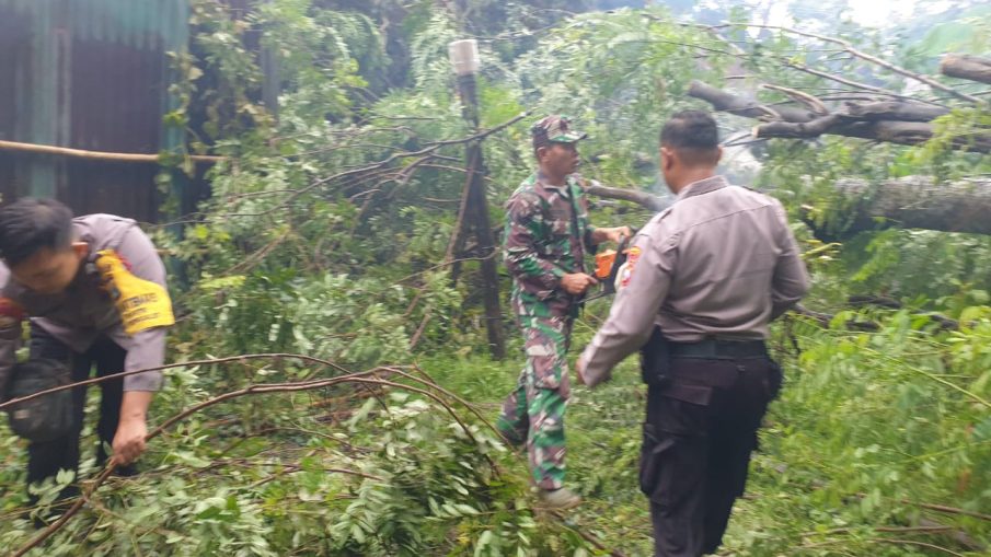 Babinsa Koramil 0806-01/Trenggalek, Serka Suprianto, bersama Bhabinkamtibmas dan BPBD Trenggalek dibantu warga sekitar langsung bergerak cepat mengevakuasi pohon yang tumbang. Dengan bantuan gergaji mesin dan semangat gotong royong, mereka bekerja keras menyingkirkan pohon dan mengamankan area terdampak.
