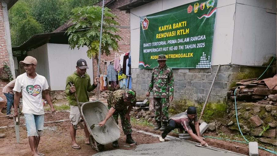 Trenggalek – Dalam rangka memeriahkan Hari Ulang Tahun (HUT) ke-80 Tentara Nasional Indonesia (TNI), satuan teritorial kewilayahan kembali menunjukkan performanya dalam memberikan karya nyata kepada masyarakat. Melalui program Bakti Teritorial Prima Renovasi Rumah Tidak Layak Huni (Rutilahu), Kodim 0806/Trenggalek bersama Koramil 0806-03/Durenan melakukan renovasi rumah milik Mujanar, warga RT 21 RW 05 Dusun Pingit Kulon, Desa Gador, Kecamatan Durenan, Senin (15/9/2025).