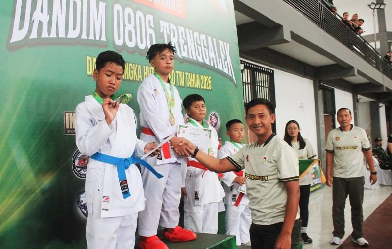 Trenggalek – Suasana penuh semangat dan sportivitas mewarnai peringatan HUT ke-80 Tentara Nasional Indonesia (TNI) di Kabupaten Trenggalek. Kodim 0806/Trenggalek sukses menggelar Kejuaraan Karate Dandim 0806/Trenggalek yang berlangsung meriah di GOR Gajah Putih, Minggu (26/10/2025). Kegiatan ini menjadi wujud nyata komitmen TNI dalam membina generasi muda melalui olahraga, khususnya cabang karate yang menjunjung tinggi nilai disiplin, sportivitas, dan semangat juang.