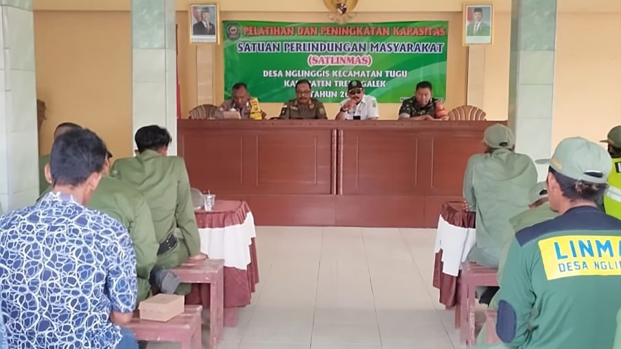 Trenggalek – Upaya memperkuat keamanan wilayah kembali digelorakan melalui sinergitas TNI-Polri bersama Satpol PP di tingkat desa. Di Desa Nglinggis, Kecamatan Tugu, Kabupaten Trenggalek, suasana Balai Desa tampak ramai, Rabu (19/11/2025). Puluhan anggota Satuan Perlindungan Masyarakat (Satlinmas) berkumpul untuk mengikuti pembekalan langsung dari tiga unsur penting pengayom masyarakat: Babinsa Nglinggis Sertu Agus Erwanto anggota Koramil 0806-09/Tugu, Bhabinkamtibmas Bripka Arwani, dan Kasat Pol PP Kecamatan Tugu Antun Yuwono. Kegiatan ini diselenggarakan untuk memperkuat ketahanan keamanan berbasis masyarakat.