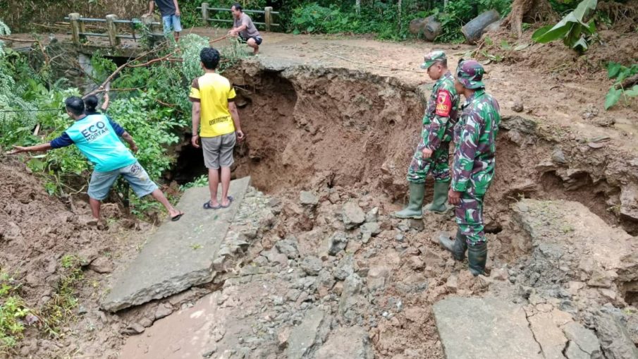 Trenggalek – Hujan deras yang mengguyur wilayah Kecamatan Suruh sejak siang hingga sore hari memicu bencana tanah longsor yang berdampak pada putusnya akses jalan penghubung antar dusun di RT 03 RW 01 Dusun Gandu, Desa Gamping, Minggu (15/3/2026). Material longsoran berupa tanah bercampur batu menutup badan jalan dan mengakibatkan mobilitas warga terganggu, sementara sebuah jembatan di lokasi yang sama juga dilaporkan mengalami kerusakan akibat derasnya aliran air hujan yang terus menggerus struktur penyangga.