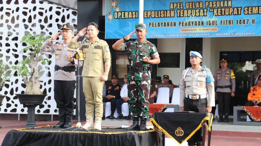 Trenggalek – Komandan Kodim (Dandim) 0806/Trenggalek Isnanto Roy Saputro, S.H., MSi., bersama Bupati Trenggalek Mochamad Nur Arifin dan Kapolres Trenggalek Ridwan Maliki, S.H., S.I.K., M.I.K., bersinergi dalam Apel Gelar Pasukan Operasi Kepolisian Terpusat Operasi Ketupat Semeru 2026 untuk pengamanan dan pelayanan perayaan Idul Fitri 1447 Hijriah di wilayah Kabupaten Trenggalek. Kegiatan tersebut digelar di Markas Polres Trenggalek, Kamis (12/3/2026).